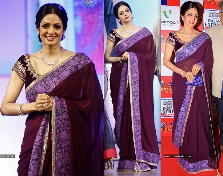 Bollywood and South Indian actress Sridevi in beautiful purple plain georgette saree designed by Manish Malhotra for TSR TV9 Awards Presentation event 2012. Violet embellished patch work designs around the gold plain border. Paired with purple designer embroidered short sleeves saree blouse.