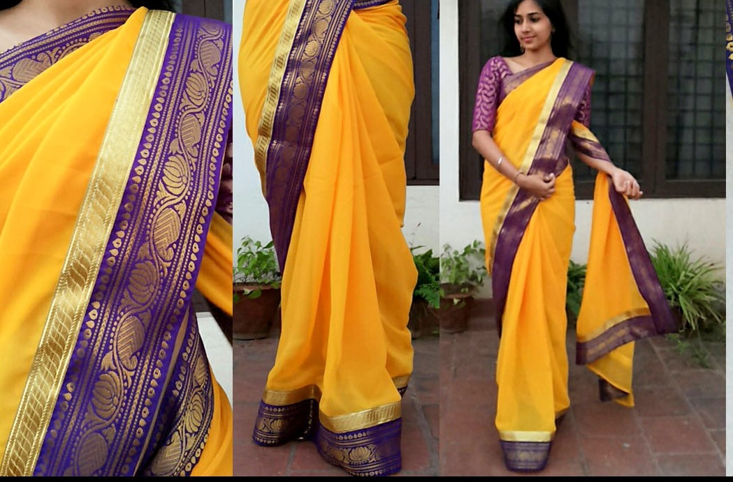 Designer sareeIndian FashionRuhaUncategorized Yellow saree from Ruha’s collection By southindiafashion - Apr 27, 2013 Yellow georgette saree lined with purple pattu borders and self gold piping.. Blouse Purple and zold zari banarssi brocade. Price Rs 3350. For orders contact: ruhaclothing(at)gmail.com / +91-9884458541