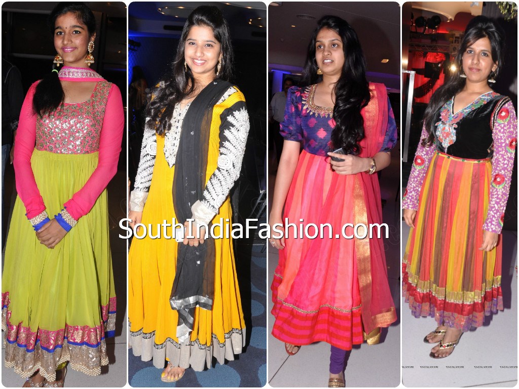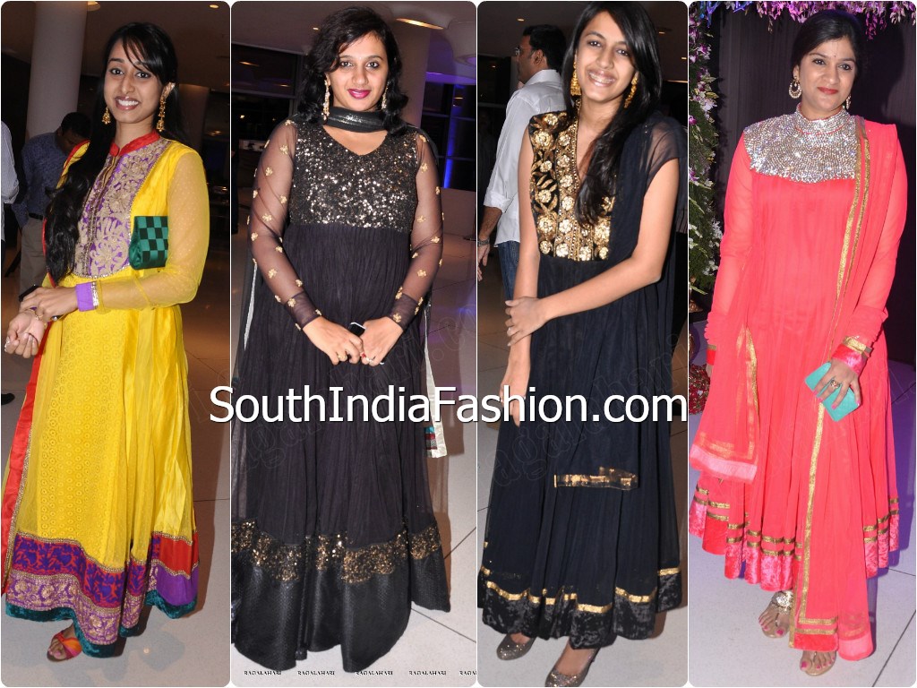 Indian FashionSalwarsUncategorized Anarkali’s at Gopichand’s Sangeet Function By southindiafashion - May 11, 2013 Celebrities spotted in colorful Anarkali suits and long salwars at Gopichand and Reshma’s sangeet ceremony.