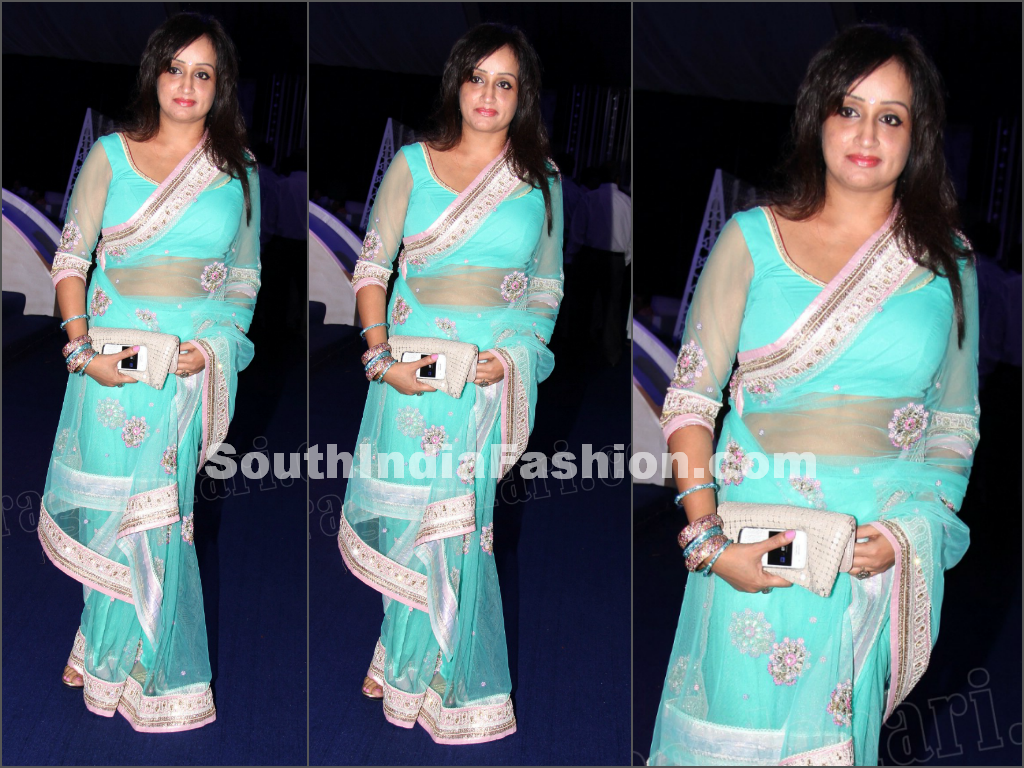 Celebrity SareesIndian FashionUncategorized Celebrity in Blue Saree By southindiafashion - May 30, 2013 Beautiful lady in sky blue netted saree paired up with designer quarter sleeves blouse.
