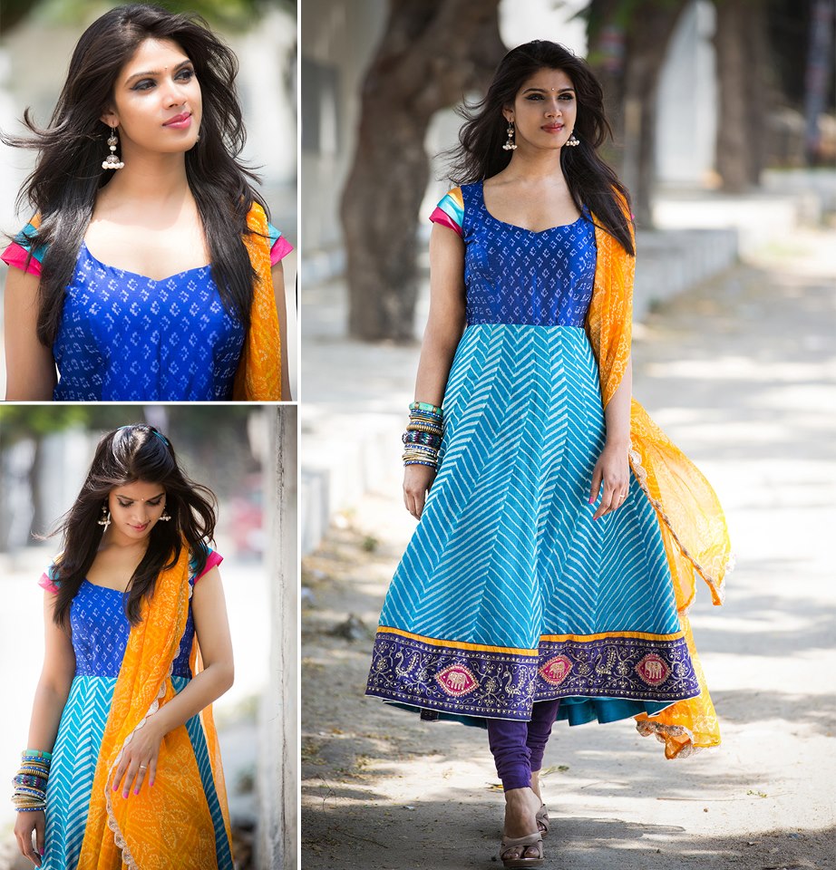 AnarkaliBhargavi KunamIndian FashionSalwarsUncategorized Designer Anarkali Suit by Bhargavi Kunam By southindiafashion - May 10, 2013 Model in sky blue and bright blue silk anarkali suit with cap sleeves, elephant motifs embellished on the border, paired with purple color cotton churidar and yellow bandhini work duppatta.