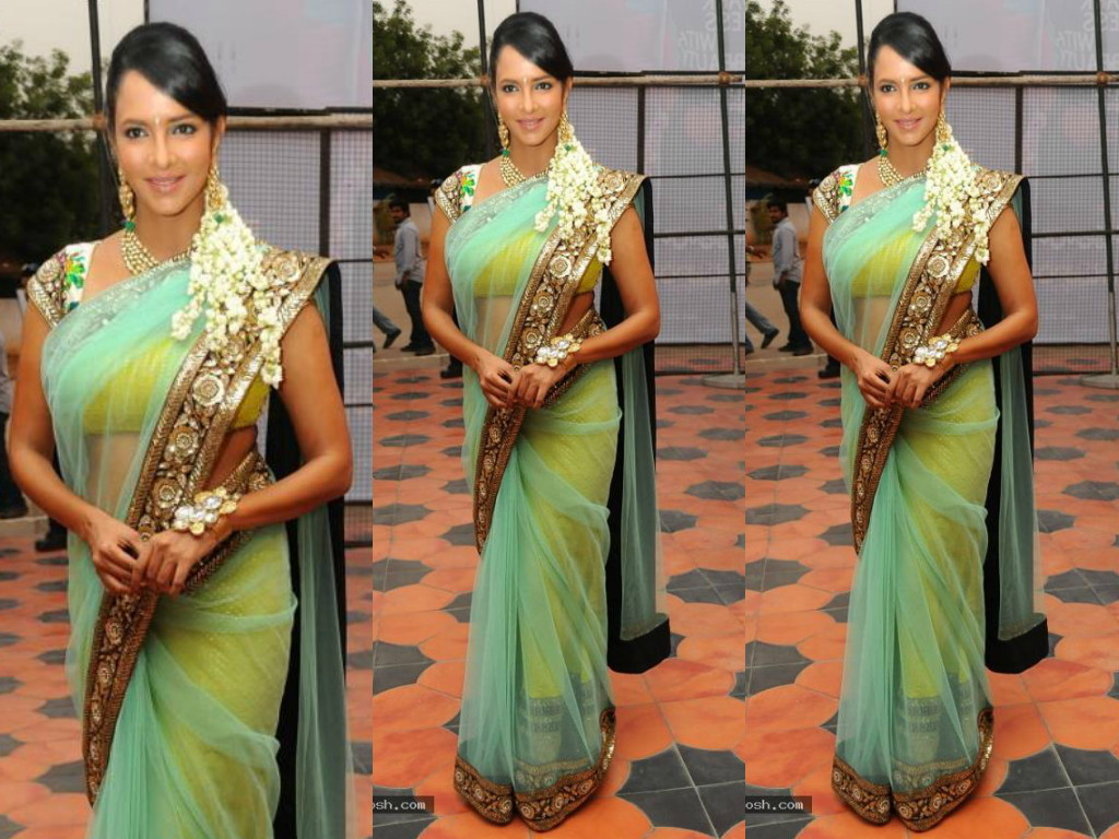 Celebrity SareesIndian FashionLakshmi ManchuSabyasachiUncategorized Lakshmi Manchu in Sabyasachi Saree By southindiafashion - May 29, 2013 South indian actress Lakshmi Manchu in sea blue Sabyasachi saree. Beautiful sea blue color netted saree with rich embellished boredr paired up with designer blouse.