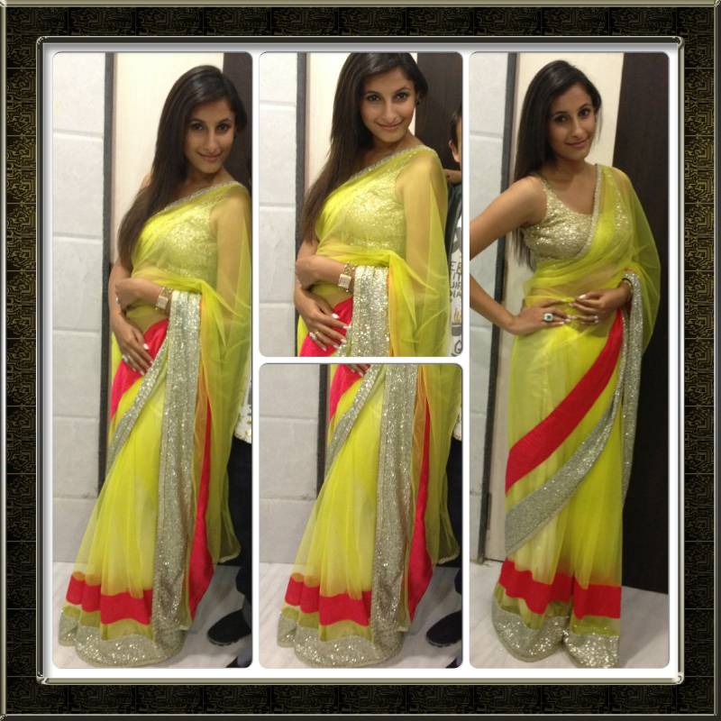 Lemon green net saree with Sequin bottom and Pink border at the bottom with sequin lace going through the saree,paired up with silver sequin blouse.