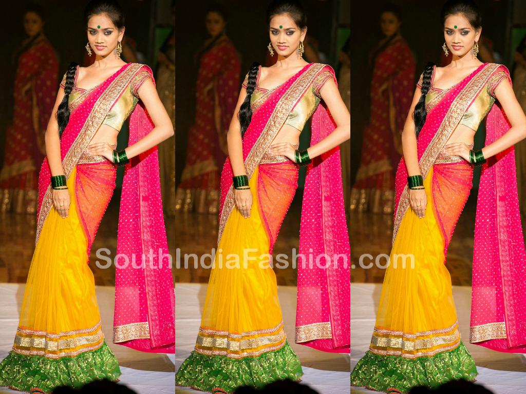 Model showcasing saree designed by Bhargavi Kunam. Half and half style saree with yellow color netted lehenga style pleats with green ruffled border, bright pink pallu with golden embellished border, paired up with designer gold color blouse.