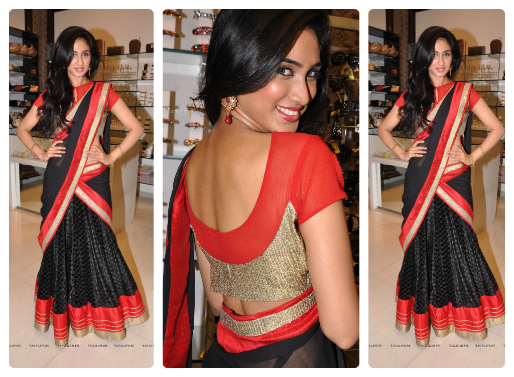 Model Deepthi Sati wearing designer half red and black half saree at Kalanikethan Bride & Groom Collection 2013 Launch, Kukatpally, Hyderabad. Black georgette lehenga with red and gold border and black duppatta with the same borders as lehenga, paired up with designer gold sequin blouse.