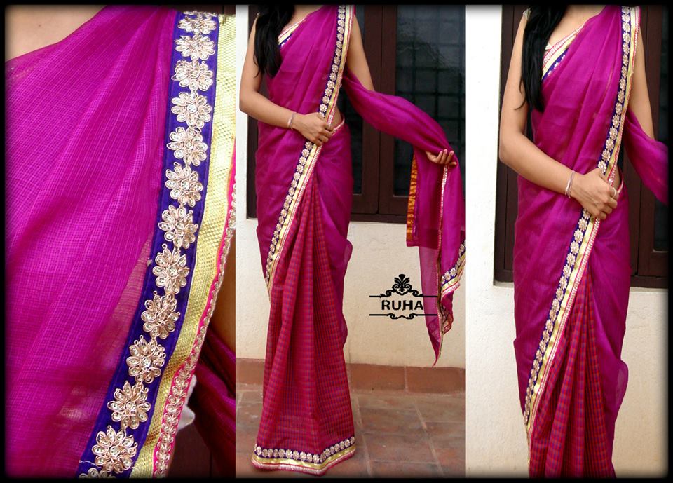 Half and half pure kota saree with checkered kora pleats .Borders purple and pink with gold piping.