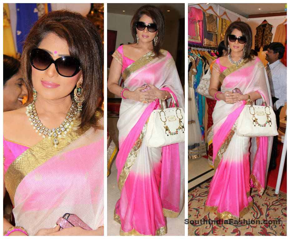 Hyderabad socialite Shreedevi Chowdary spotted in silk kota sari with gold gota patti with a fusia pink with golden polka dots raw silk backing at “Akritti Elite’ Exhibition @ Taj Krishna . Saree is designed by Sailesh of Singhania store, Hyderabad and blouse is designed by Deepthi Rajesh. She finished the look with kundan necklace and earrings.