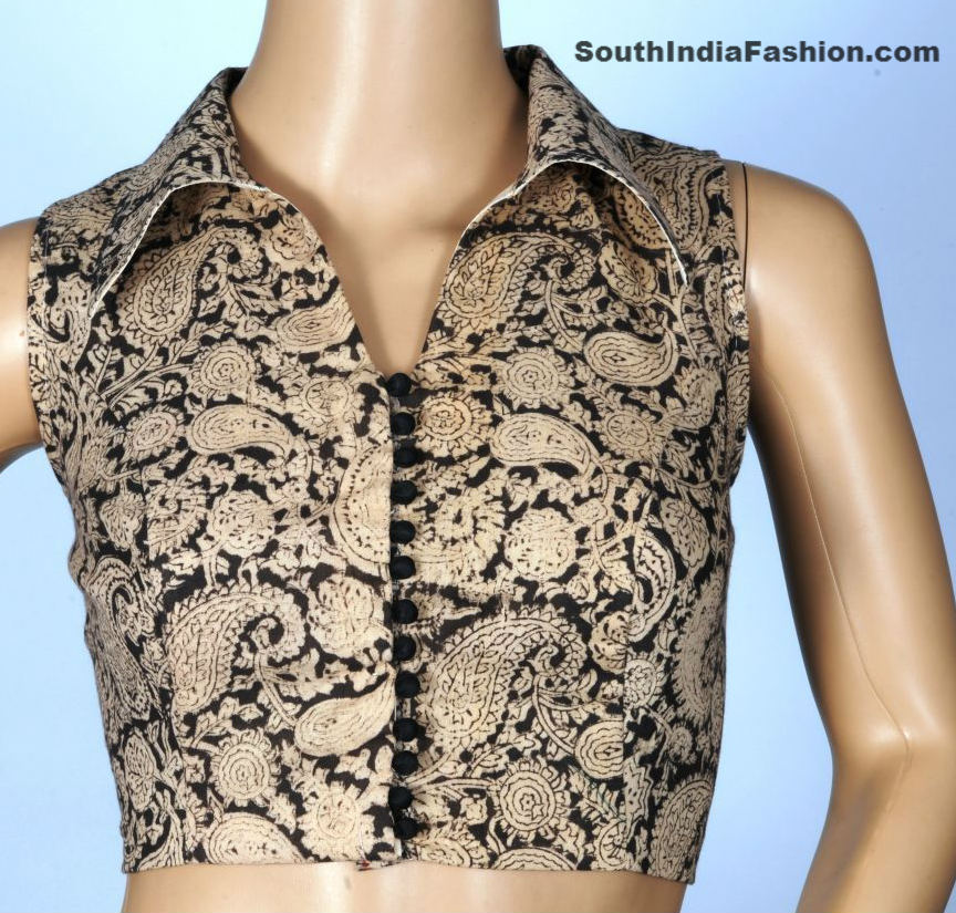 Indian FashionLatest Blouse DesignsUncategorized Kalamkari Print Collar Neck Blouse By southindiafashion - Jun 24, 2013 Collar neck pattren sleeveless saree blouse with kalamkari print.