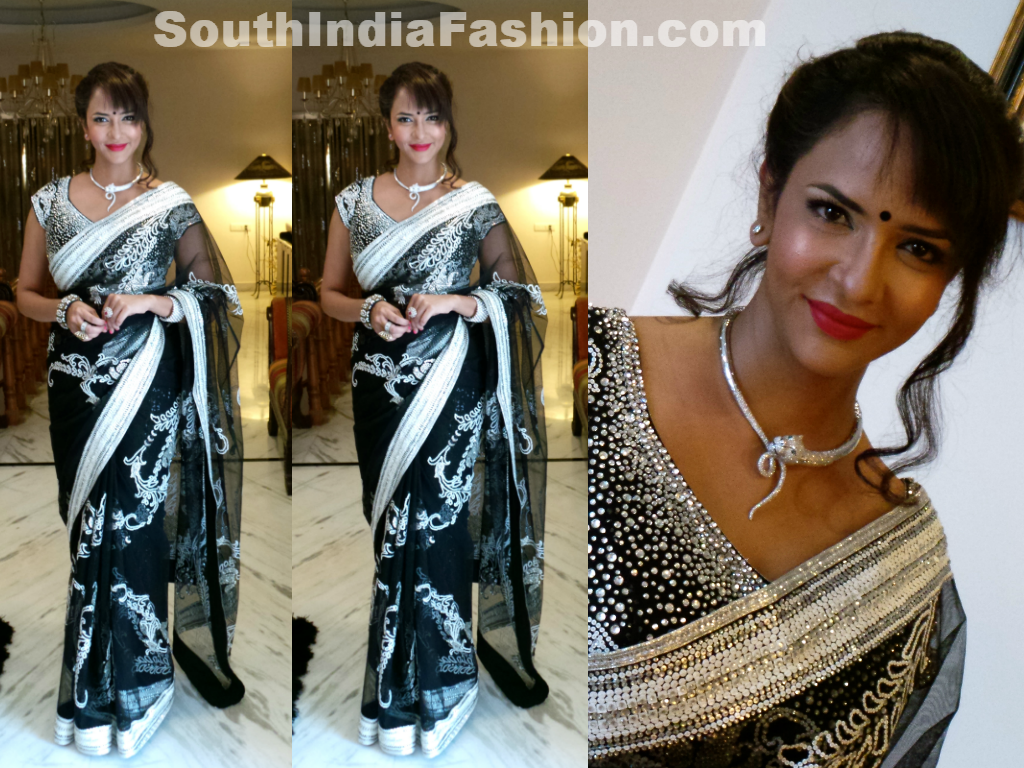 Celebrity SareesIndian FashionLakshmi ManchuUncategorized Lakshmi Manchu in Black and Silver Saree By southindiafashion - Jun 2, 2013 Manchu Lakshmi in designer black net saree with silver embellishments all over the saree and silver border, paired up with designer black blouse with heavy kundan work.