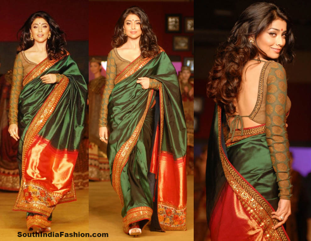 Backless BlouseCelebrity SareesIndian FashionSabyasachishriyaUncategorized Shriya Looks Fabulous in Sabyasachi Saree By southindiafashion - Jun 15, 2013 Shriya Saran looks classy and beautiful in green Sabyasachi saree with embroidered zari border paired with full sleeves embellished matching brocade tie back blouse. Loved this look!