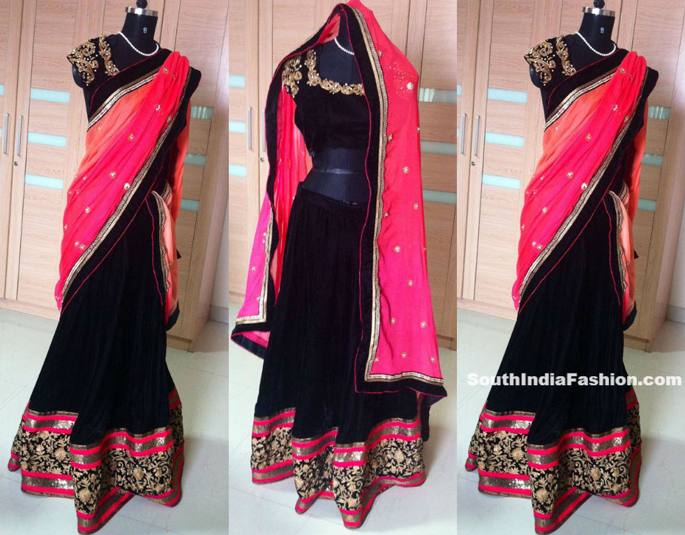 Black lehenga with heavy border, pink and orange double shaded duppatta with black border, paired up with heavy work black blouse. Designed by Tansi Couture.