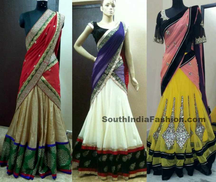 Beautiful designer half sraees with rich work lehengas, and impressively designed duppattas, paired up with designer blouses. Designed by Madhu Verma of Monk by Madhu boutique.