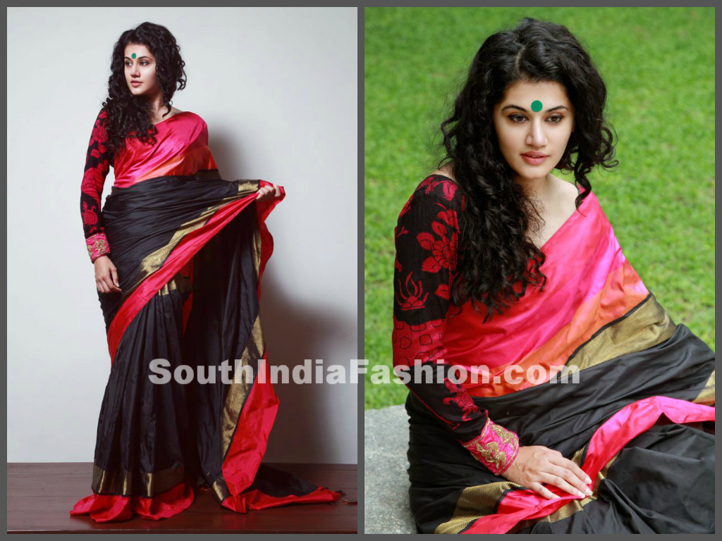 Celebrity SareesGaurang ShahIndian FashionTapsiUncategorized Tapsi in Gaurang Shah Saree By southindiafashion - Jun 12, 2013 South indian actress Tapsi looking elegant in saree designed by Gaurang Shah. Black and pink uppada silk saree paired up with designer full sleeves blouse in black and pink color combination.