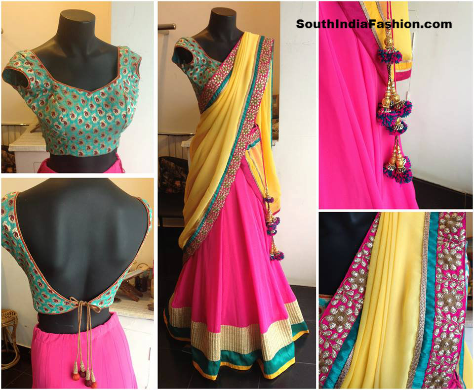 Beautiful half saree in eye catching color combination. Pink lehenga and yellow duppatta, paired up with backless green brocade blouse. Designed by NVY studio.