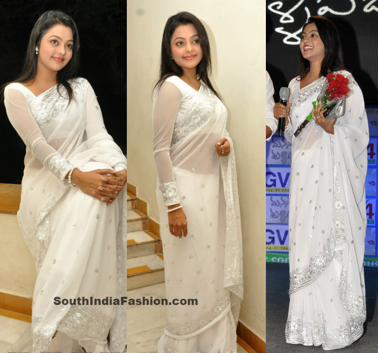 Celebrity SareesIndian FashionUncategorized Kajal Yadav in White Saree By southindiafashion - Jul 3, 2013 South indian actress Kajal Yadav spotted in white saree paired up with white long sleeves blouse at Manasa Thullipadake audio release.