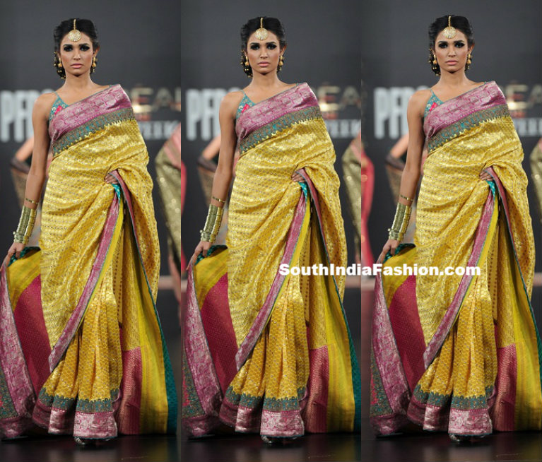 Bridal SareesCelebrity SareesIndian FashionUncategorized Model in Yellow Traditional Saree By southindiafashion - Jul 10, 2013 Model in beautiful yellow benaras silk saree with pink border, paired up with sleeveless blouse.