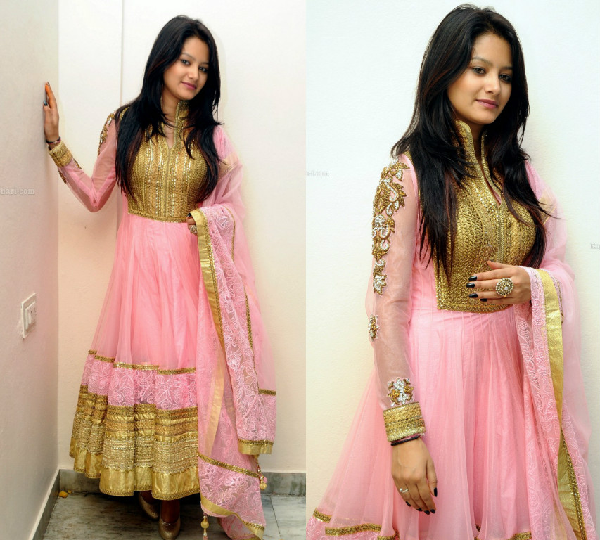 AnarkaliHyderabad ShoppingIndian FashionSalwarsUncategorized Monica Singh in Stunning Pink Anarkali By southindiafashion - Jul 16, 2013 Model and actress Monica Singh in gorgeous pink floor length anarkali, gold heavy border, high neck pattern, sheer embellished full sleeves, paired up with pink duppatta. Designed by Neeru’s Emporio, Hyderabad.