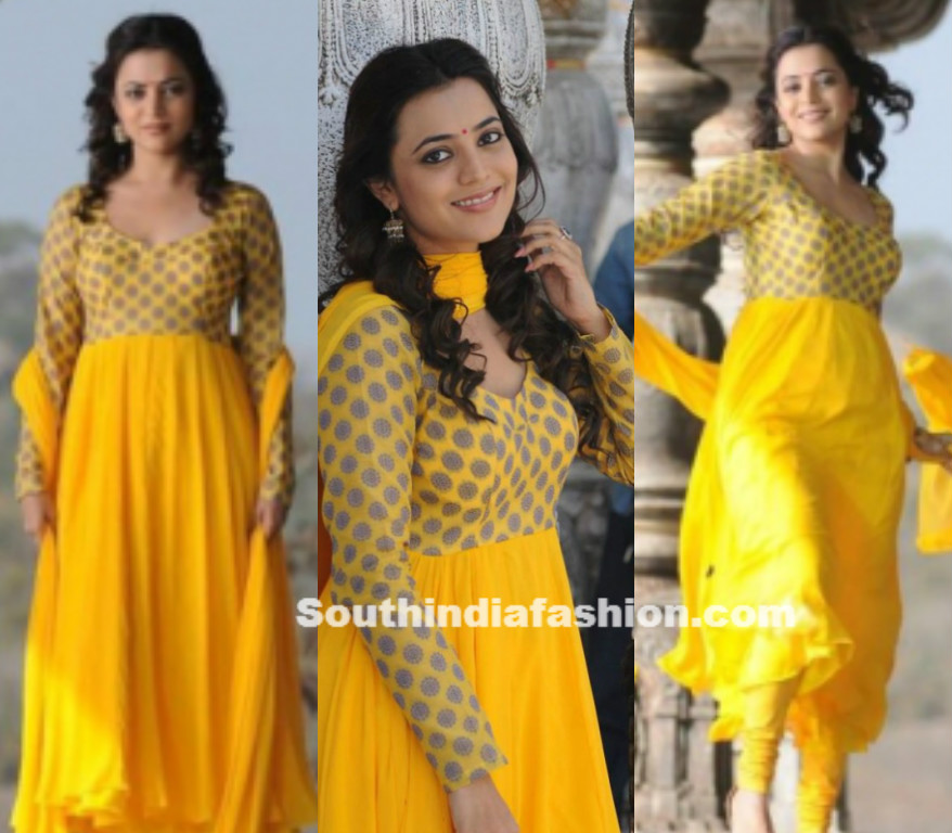 AnarkaliIndian FashionSalwarsUncategorized Nisha Agarwal in yellow Anarkali By southindiafashion - Jul 1, 2013 Nisha Agarwal in yellow full sleeves anarkali with grey polka dots on the yoke portion.