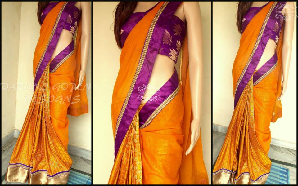 Jute half and half saree with orange brocade pleats and gold zari border and plain orange fabric for the remaining saree with purple borders, paired up with purple brocade blouse.