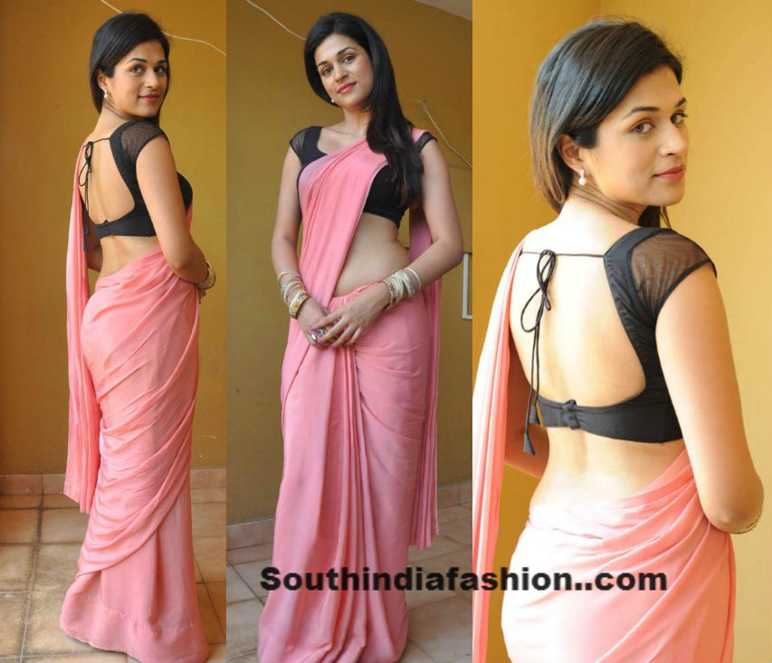 back neck blousesBackless BlouseCelebrity SareesIndian FashionShradda DasUncategorized Shradda Das in Pink Crepe Saree By southindiafashion - Jul 6, 2013 South indian actress Shradda Das in plain pink crepe saree, paired up with black short sleeves blouse with deep back neck pattern.