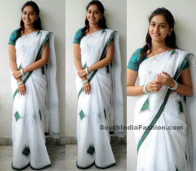 Celebrity SareesIndian FashionUncategorized Sri Divya in Cotton saree By southindiafashion - Jul 3, 2013 South indian actress Sri Divya in white simple cotton saree paired up with blue floral print blouse.
