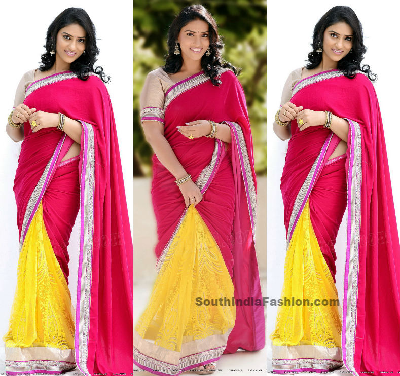 Celebrity SareesIndian FashionUncategorized Sri Sudha in Half and Half Saree By southindiafashion - Jul 2, 2013 Character artist Sri Sudha in pink and yellow half and half saree, yellow net pleats and pink pallu, paired up with cream color blouse.