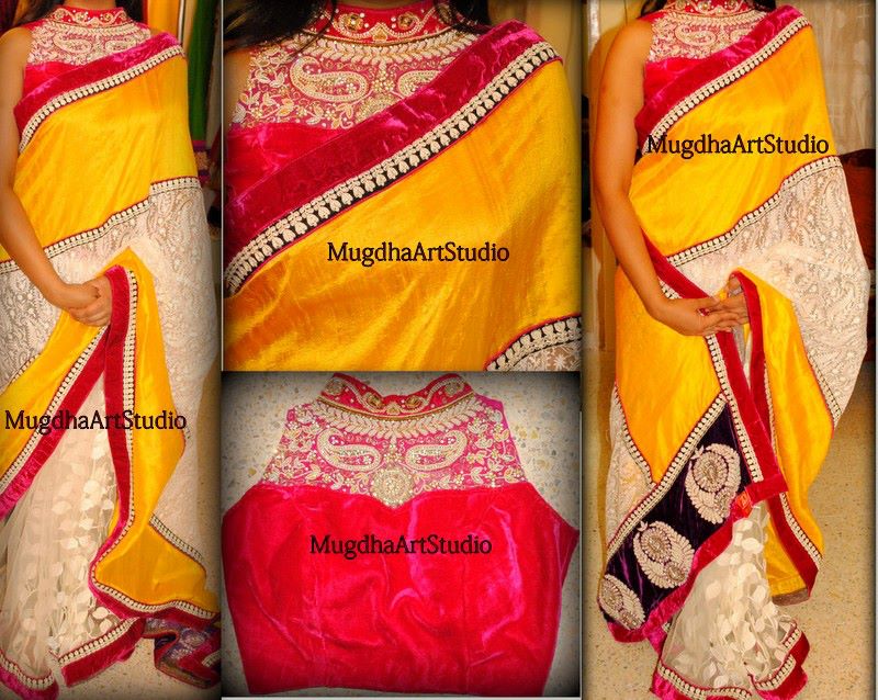 Yellow and white designer saree with pink velvet borders, teamed up with trendy high neck velvet sleeveless blouse with pearl work and swaroski work, by Mugdha Art Studio.