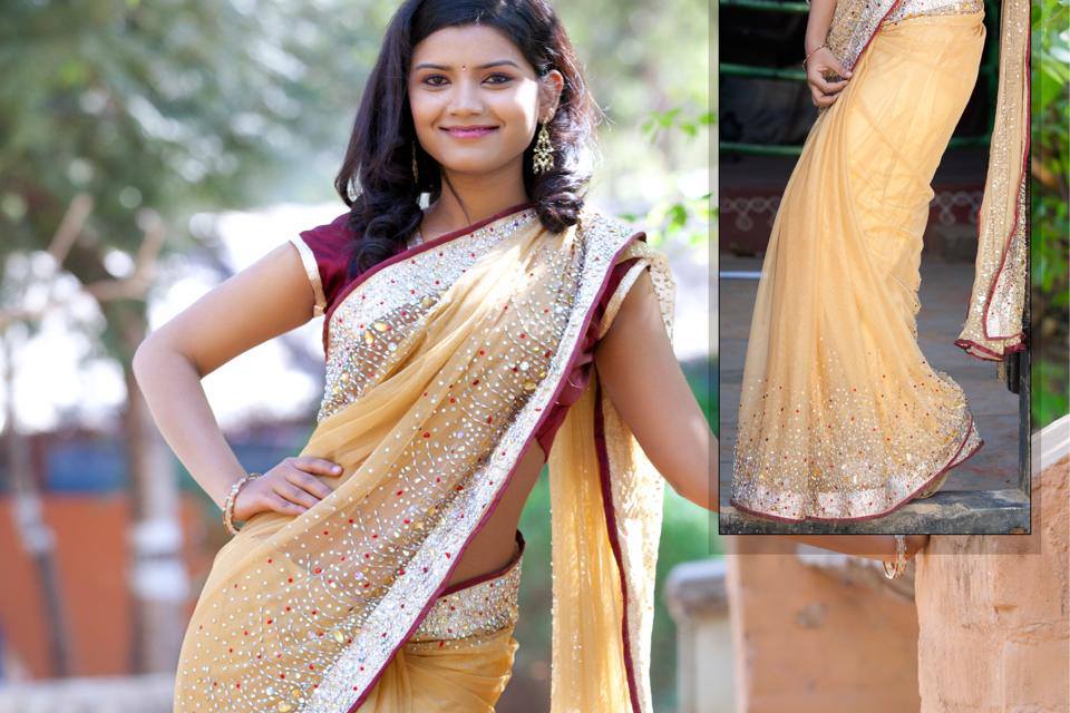 Cream color saree with embellished borders, paired up with maroon color blouse, designed by Divya.
