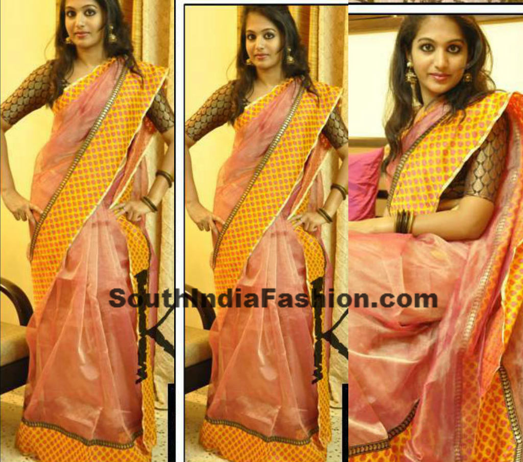 Pink tissue saree with orange and pink brocade border, paired up with black or pink brocade blouse.
