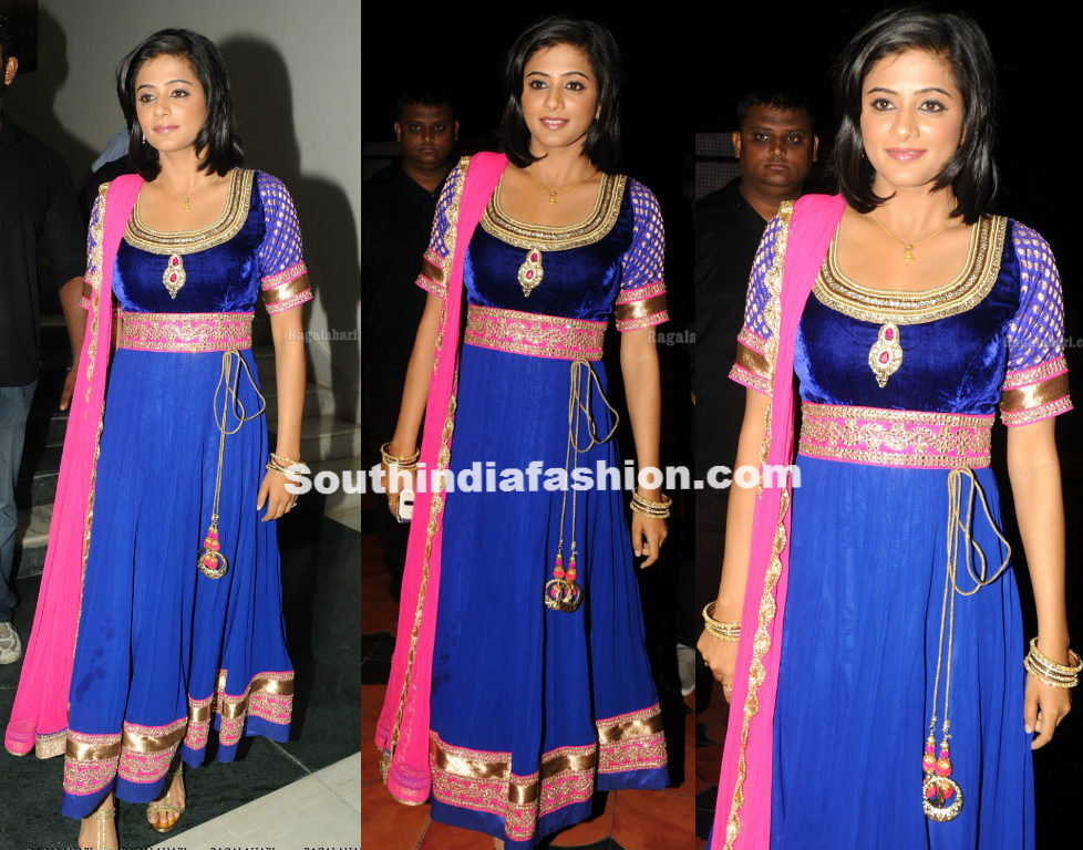 AnarkaliIndian FashionSalwarsUncategorized Priyamani in Royal Blue Anarkali By southindiafashion - Aug 13, 2013 Priyamani attended the audio release function of her upcoming movie “Chandi” in beautiful royal blue floor length anarkali with velvet yoke and benaras sleeves paired up with fuschia pink duppatta. She looked great. Loved her new hair style.