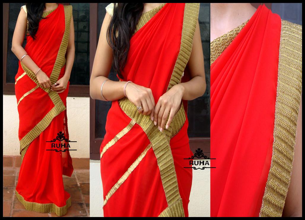 Red georgette saree with antique gold borders paired up with shimmer or brocade blouse by Ruha.