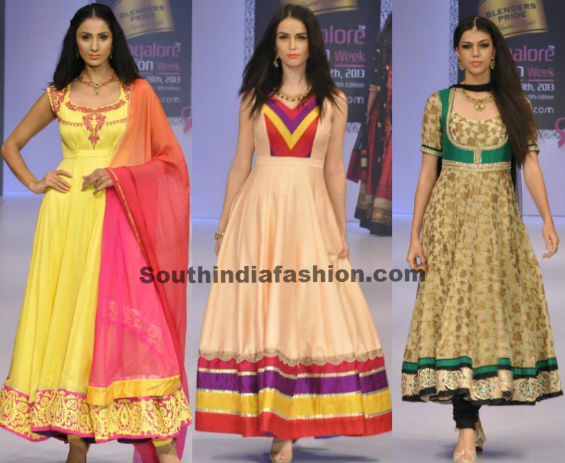 Colorful floor length anarkali’s with intricate borders and charming color combinations, designed by Sagar Tenali.