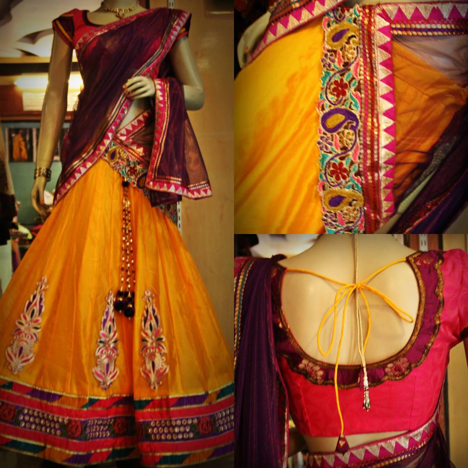 Yellow lehenga and wine colored duppatta, paired up with pink designer blouse by Sony Reddy.
