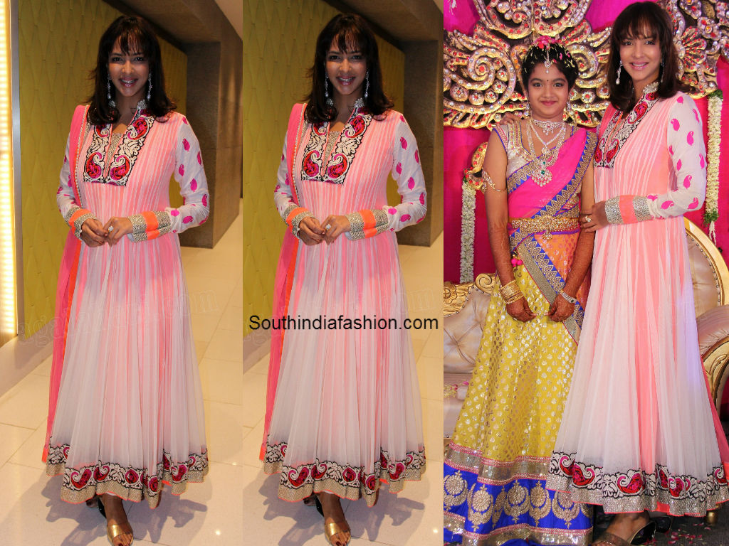 AnarkaliIndian FashionLakshmi ManchuSalwarsUncategorized Lakshmi Manchu in Pink Anarkali By southindiafashion - Sep 5, 2013 Lakshmi Manchu made an appearance at Anjali’s half saree function in pink and white double shaded netted anarkali with polk dots full sleeves.