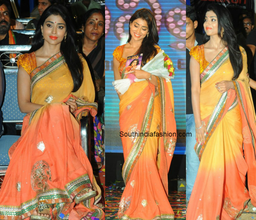 Celebrity SareesIndian FashionshriyaUncategorized Shriya in Double Shaded Saree By southindiafashion - Sep 9, 2013 Actress Shriya Saran in yellow and orange georgette double shaded saree, paired up with orange brocade puff sleeves blouse.