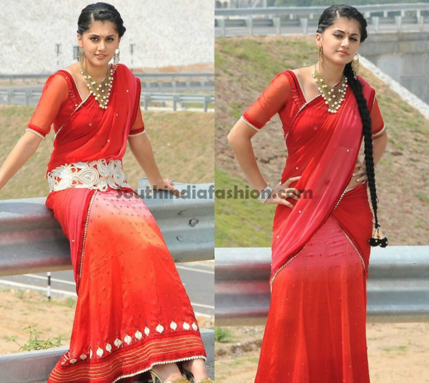 Celebrity SareesHalf SareesIndian FashionTapsiTeen FashionUncategorized Tapsi in Red Half Saree By southindiafashion - Sep 10, 2013 Actress Tapsi in pink and red double shaded lehenga and matching duppatta paired up with designer red blouse with elbow length net sleeves.