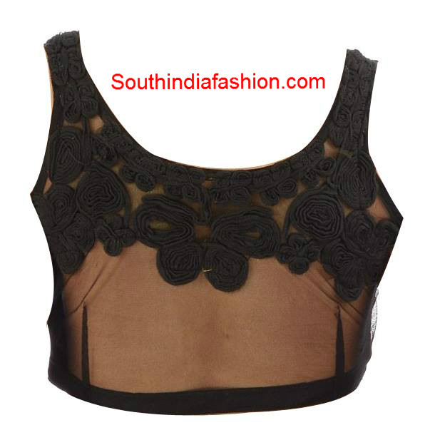 Latest saree blouse design with sleeveless pattern, flower embroidery over transparent netted back, designed by Divya kanakia.