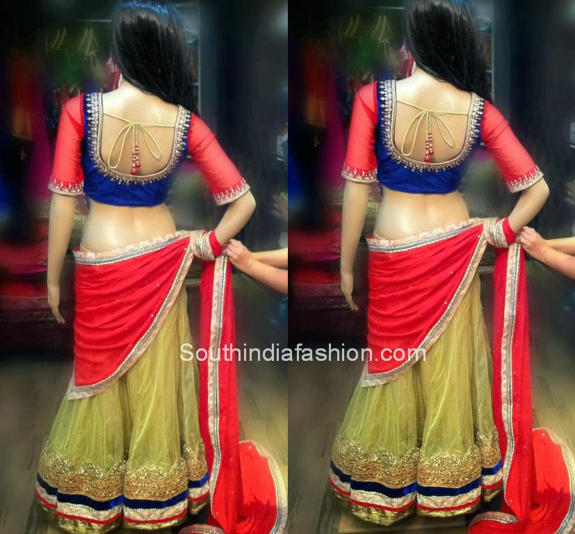 Beautiful designer half saree with cream net lehenga, red duppatta, paired up with blue and red quarter sleeves designer blouse, designed by Ashwini Reddy of Prashwi.