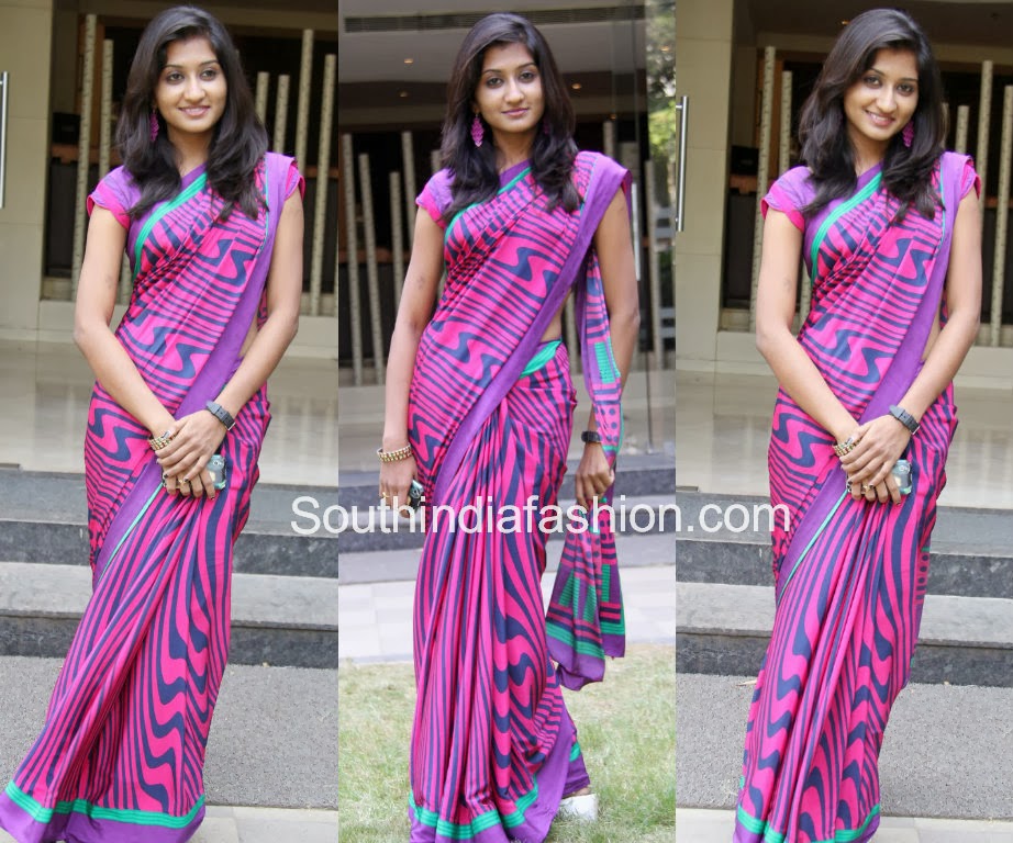 Celebrity SareesIndian FashionUncategorized Akshaya in Printed Saree By southindiafashion - Nov 16, 2013 Actress Akshaya in pink zebra print saree.