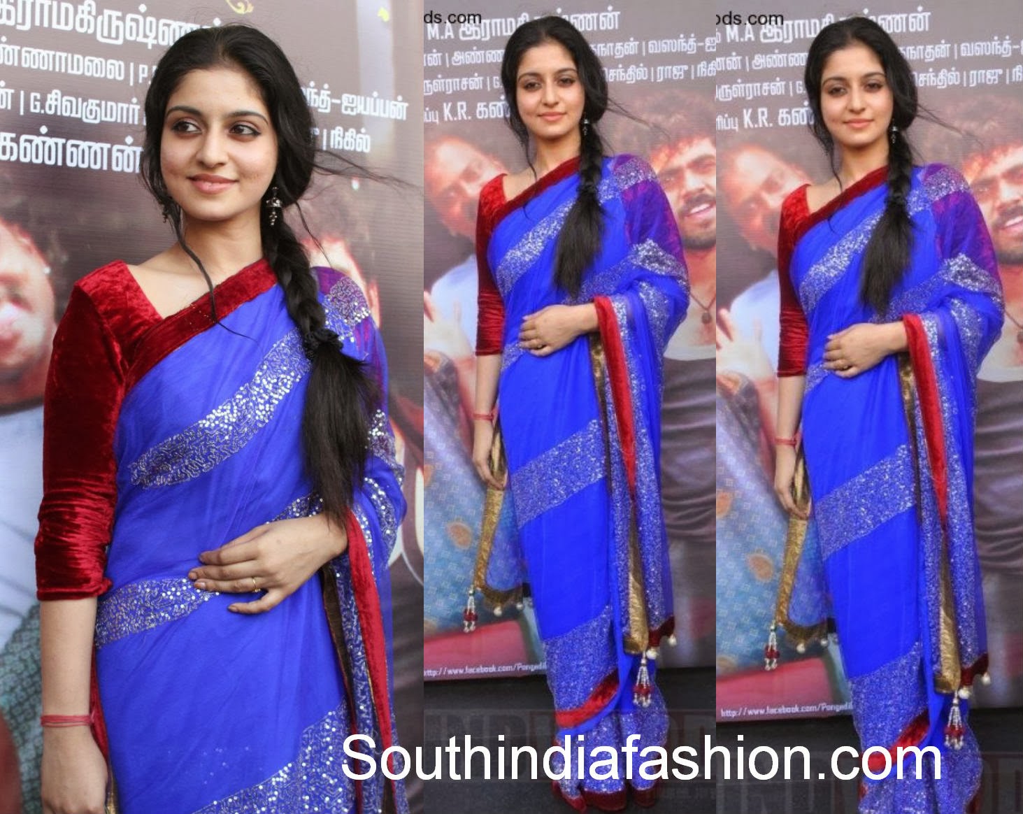 Celebrity SareesIndian FashionUncategorized Athmiya in Blue Sequin Saree By southindiafashion - Nov 21, 2013 Tamil actress Athmiya in blue net saree with horizontal sequin work and maroon velvet border, paired up with maroon velvet quarter sleeves blouse.