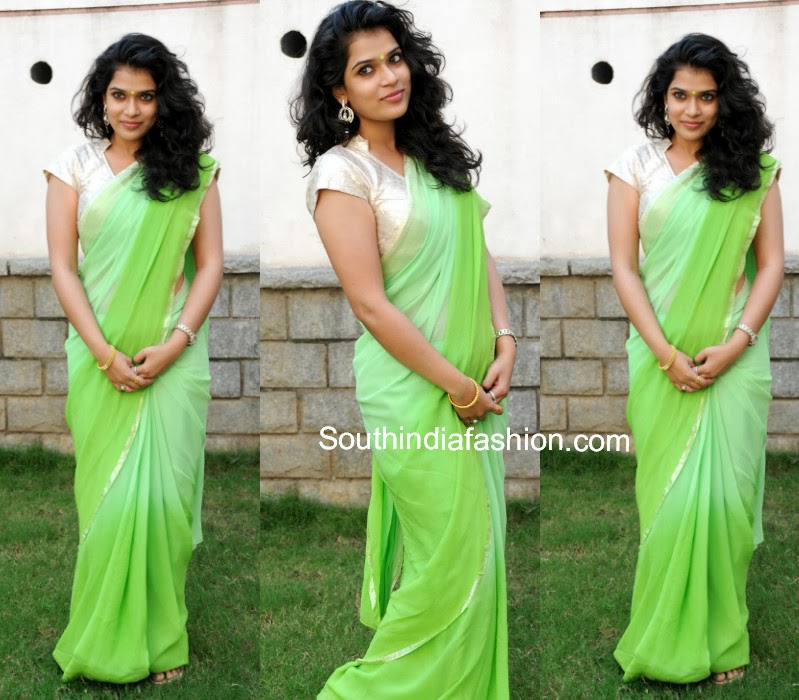 Celebrity SareesIndian FashionUncategorized Bhargavi in Double Shaded Plain Saree By southindiafashion - Nov 11, 2013 Actress Bhargavi in double shaded green plain saree, paired up with collar neck off white shimmer blouse.
