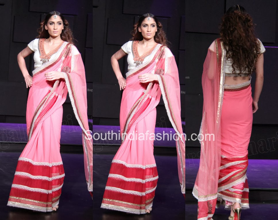 Celebrity SareesIndian FashionUncategorized Model in Pink Saree By southindiafashion - Nov 10, 2013 Model wearing pink light weight chiffon saree with red border on one side and white border on one side, paired up with white short sleeves blouse.