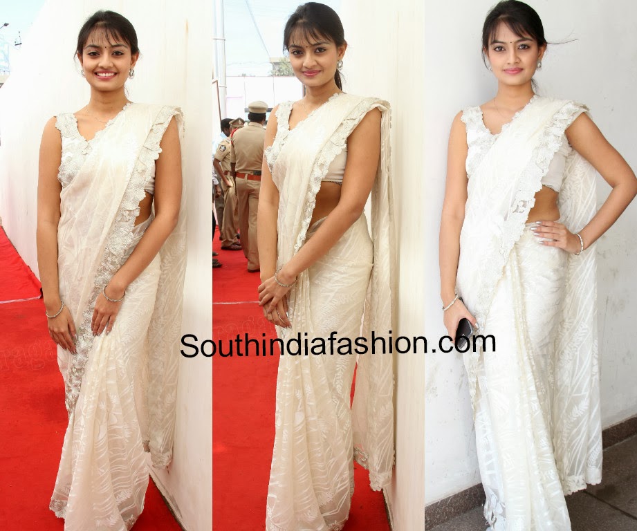 Celebrity SareesIndian FashionUncategorized Nikhita Narayan in White Saree By southindiafashion - Nov 20, 2013 Actress Nikhita Narayan in white saree with cut work lace border, paired up with sleeveless blouse.