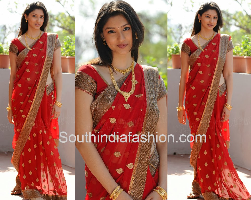 Celebrity SareesIndian FashionUncategorized Tanvi Vyas in Red Saree By southindiafashion - Nov 22, 2013 Actress Tanvi Vyas in red georgette saree with antique border and bhuttis all over the saree.