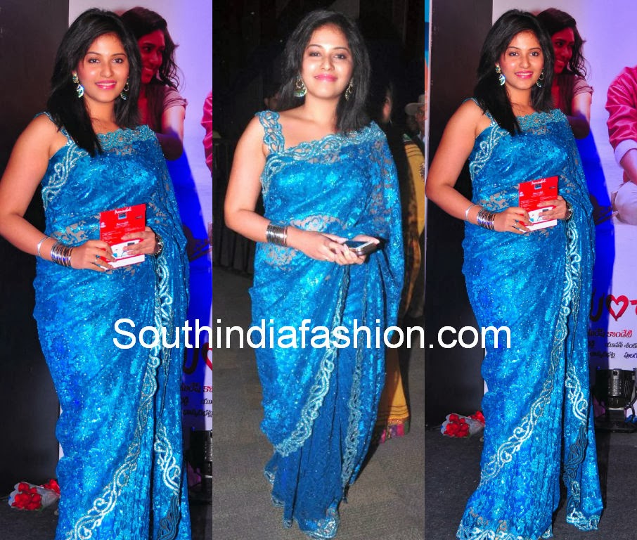 AnjaliCelebrity SareesIndian FashionUncategorized Anjali in Blue Lace Work Saree By southindiafashion - Dec 21, 2013 Actress Anjali in blue lace work saree with cut work border.