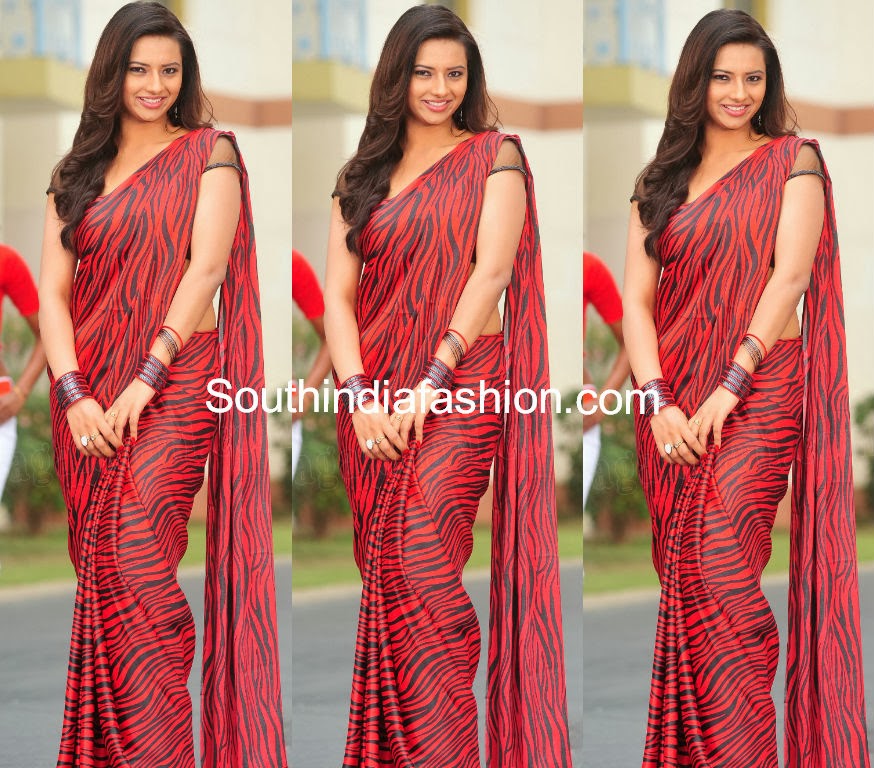 Celebrity SareesIndian FashionUncategorized Isha Chawla in Fancy Crepe Saree By southindiafashion - Dec 17, 2013 Isha Chawla in red and black striped crepe fancy saree paired up with black blouse with net sleeves.
