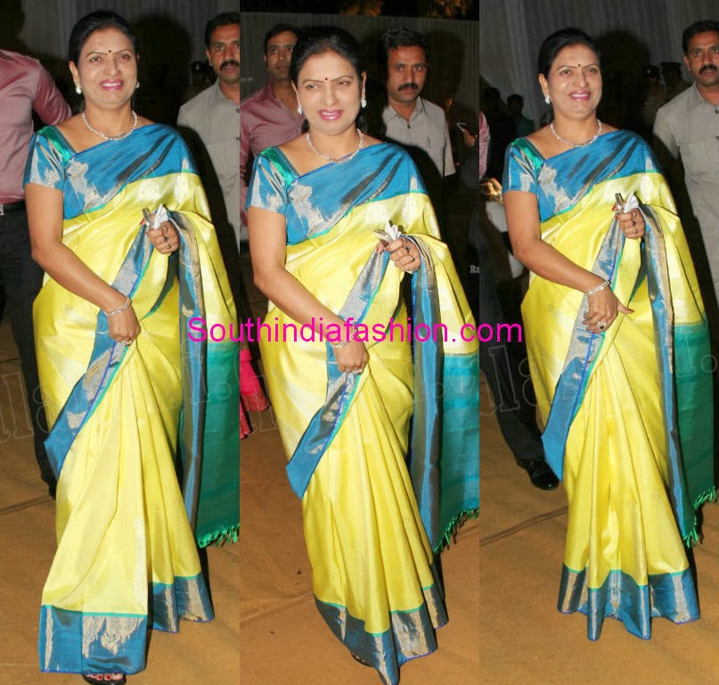 Bridal SareesCelebrity SareesIndian FashionUncategorized Minister D K Aruna in Bridal Saree By southindiafashion - Dec 29, 2013 Minister D K Aruna in lemon yellow kanjeevaram saree with blue shimmer kadi border, paired up with blue shimmer blouse.