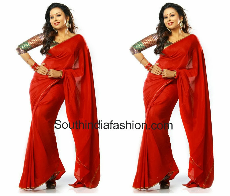 Celebrity SareesIndian FashionUncategorized Mrudula Murali in Plain Red Saree By southindiafashion - Dec 12, 2013 Actress Mrudula Murali in plain red georgette saree paired up with quarter sleeves brocade blouse.