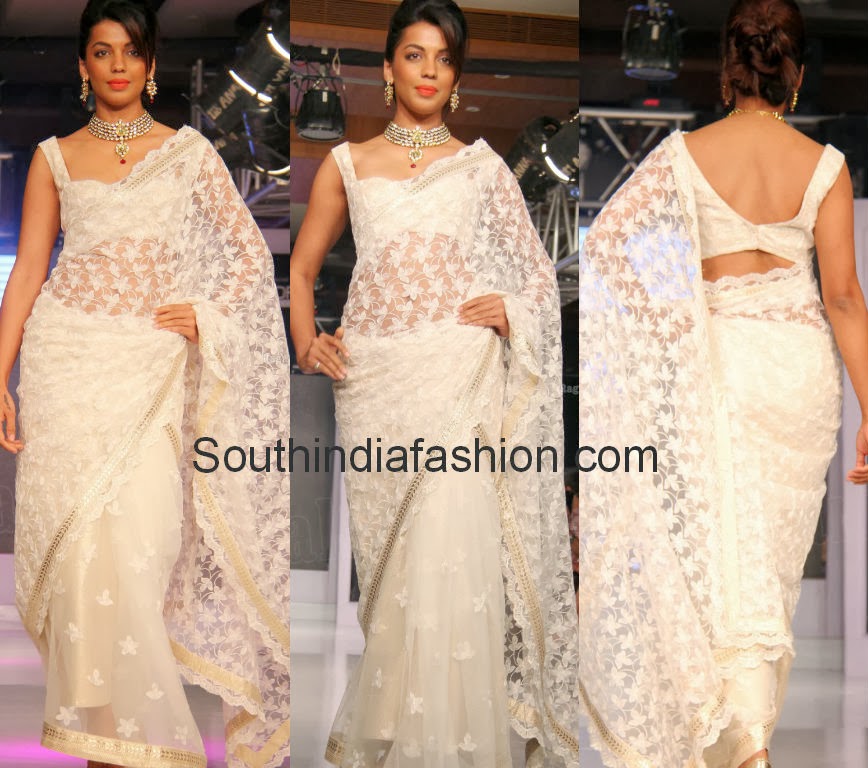Celebrity SareesFashion ShowIndian FashionUncategorized Mugdha Godse in White Brasso Saree By southindiafashion - Dec 26, 2013 Mugdha Godse in half and half white saree with georgette pleats and brasso pallu paired up with sleeveless blouse at Hyderabad Fashion Week.