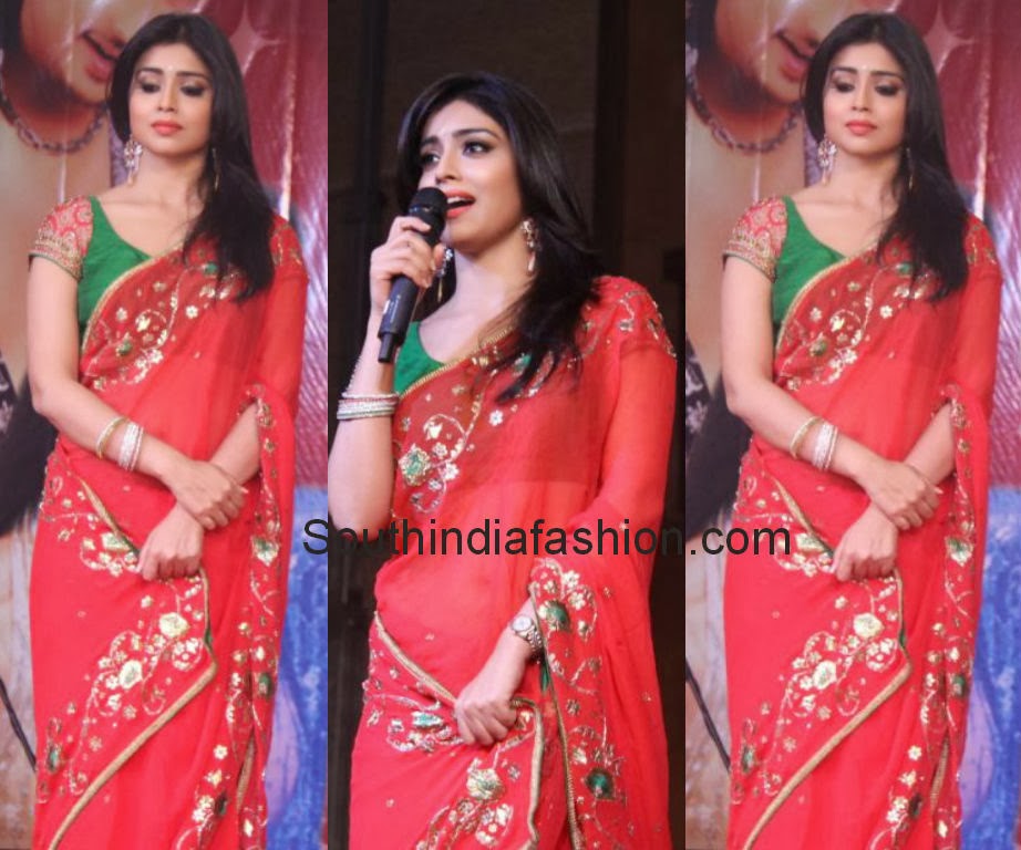 Celebrity SareesIndian FashionshriyaUncategorized Shriya Saran in Red Saree By southindiafashion - Dec 31, 2013 Actress Shriya Saran in red georgette saree with embellished borders, paired up with short sleeves green and red blouse.